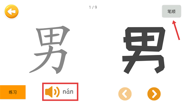 4、在詳細學(xué)習(xí)頁面,可點擊【筆順】查看筆畫順序,點擊讀音按鈕(nán)聽讀音,進行“男”字的認讀與筆順學(xué)習(xí)。