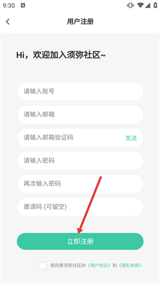 4、在注冊信息填寫頁面輸入賬號、郵箱、密碼等信息后,點擊【立即注冊】,完成須彌社區(qū)APP注冊流程。