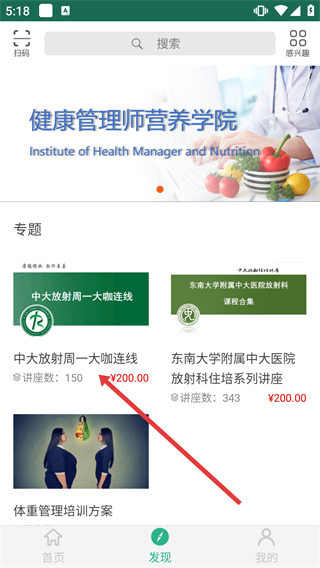 1、在【健康管理師營養(yǎng)學(xué)院】的發(fā)現(xiàn)頁面,找到【中大放射周一大咖連線】課程,點(diǎn)擊進(jìn)入課程詳情頁。