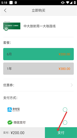 3、在立即購買頁面,選擇套餐,選擇支付方式,點(diǎn)擊【支付】。