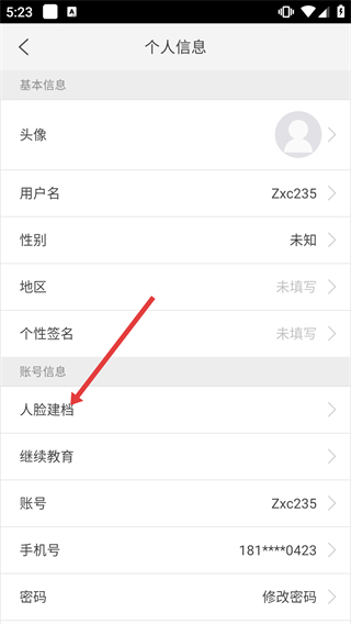 3、進(jìn)入個人信息頁面,找到【人臉建檔】選項(xiàng)并點(diǎn)擊。