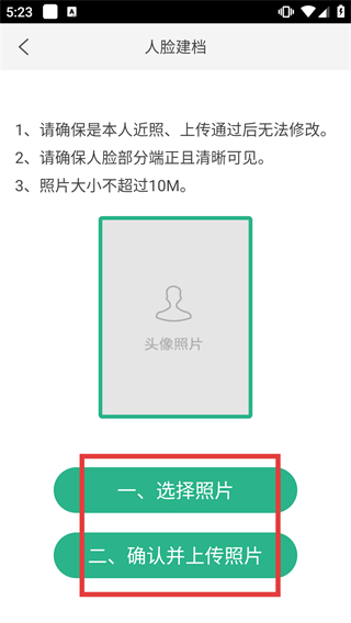 4、進(jìn)入人臉建檔頁面后,點(diǎn)擊【一、選擇照片】,選取本人近照。