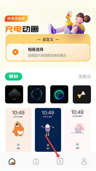1、打開充電動畫APP,點擊底部下載圖標,進入動態(tài)壁紙板塊,可瀏覽各類動態(tài)壁紙資源。