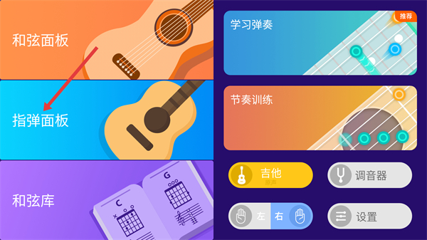 2、在功能主頁(yè)面,選擇【指彈面板】模塊,可切換至對(duì)應(yīng)的學(xué)習(xí)界面,還能選【和弦面板】【和弦?guī)臁康饶K輔助學(xué)習(xí)。