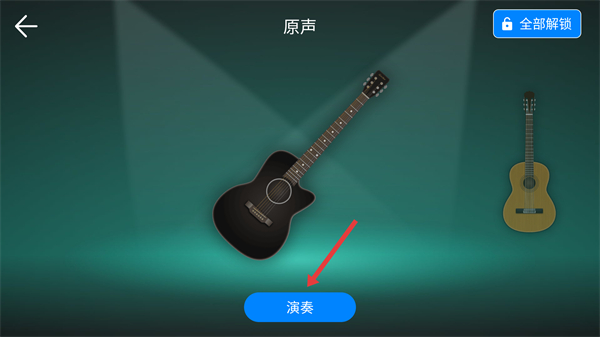 4、在原聲吉他選擇界面,點(diǎn)擊下方【演奏】按鈕,即可進(jìn)入該吉他對(duì)應(yīng)的演奏模式,使用該樂(lè)器進(jìn)行彈奏練習(xí)。