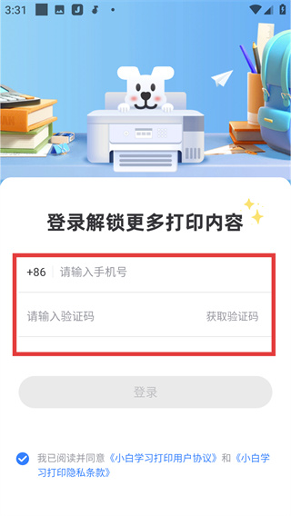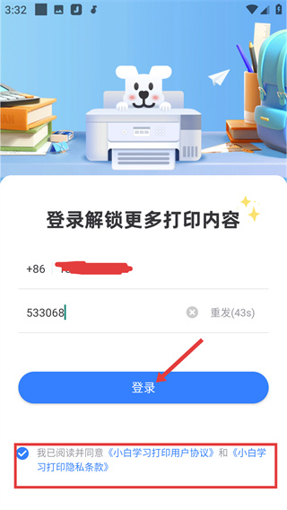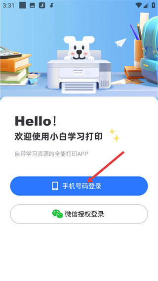 1、在【小白學習打印】APP登錄頁面選擇【手機號碼登錄】,進入手機號驗證登錄流程。