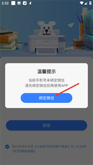 4、提示手機號未綁定微信,點擊【綁定微信】,完成微信綁定后即可完成注冊正常使用APP。