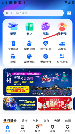 1、在APP首頁(yè)點(diǎn)擊【旅行團(tuán)】選項(xiàng),進(jìn)入旅行團(tuán)預(yù)訂頁(yè)面。