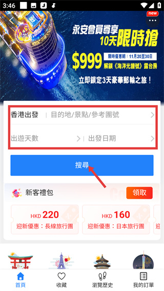 2、在旅行團(tuán)頁(yè)面填寫【香港出發(fā)】等信息后,點(diǎn)擊【搜尋】按鈕,進(jìn)入目的地選擇環(huán)節(jié)。