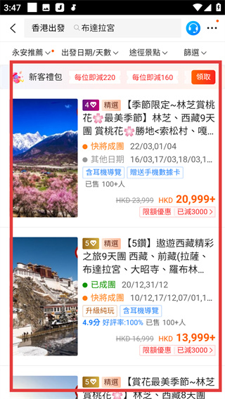 4、在搜索結(jié)果頁(yè)面查看包含【布達(dá)拉宮】的旅行團(tuán)信息,可選擇對(duì)應(yīng)行程進(jìn)行預(yù)訂。