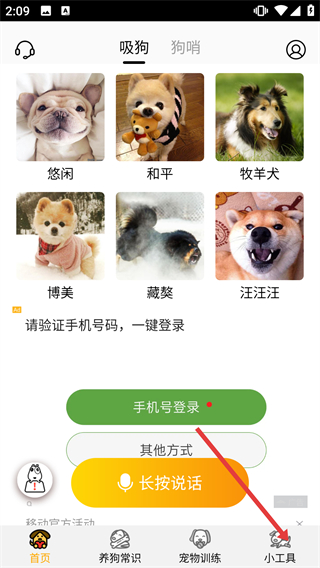 2、在首頁底部點擊“小工具”選項,進入包含狗狗年齡轉(zhuǎn)換功能的工具頁面。