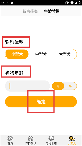 3、在年齡轉(zhuǎn)換頁面選擇狗狗體型,輸入狗狗年齡后,點擊“確定”按鈕。