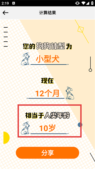 4、系統(tǒng)將自動計算并展示結(jié)果,完成狗狗年齡的人類年齡換算。