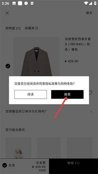 2、在購物籃頁確認商品信息后,點擊底部【繼續(xù)】按鈕,觸發(fā)隱私政策與購物條款確認彈窗。