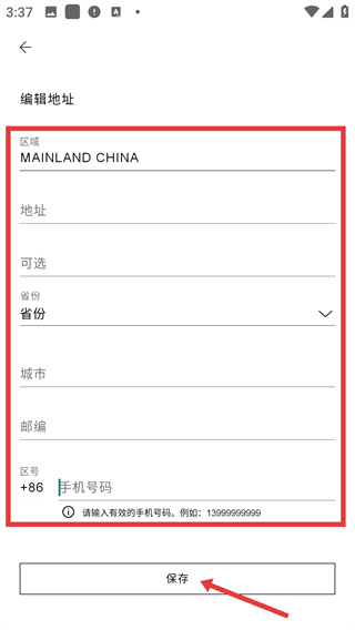 4、在地址編輯頁填寫區(qū)域、地址、省份、城市、郵編及手機號碼等信息后,點擊【保存】完成地址設置,付款后即可完成購買操作。