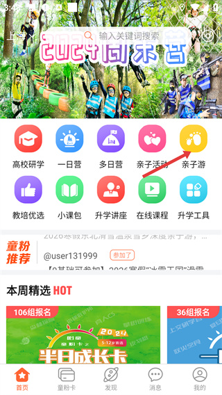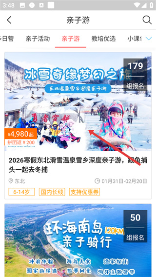 2、在首頁(yè)功能區(qū)點(diǎn)擊【親子游】選項(xiàng),進(jìn)入親子游活動(dòng)列表頁(yè)面。