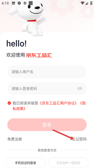 1、在【京東工品匯】登錄頁(yè)找到【忘記密碼】選項(xiàng)并點(diǎn)擊,進(jìn)入密碼找回的初始操作界面。