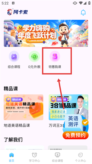 1、在阿卡索首頁(yè)點(diǎn)擊“特惠購(gòu)課”選項(xiàng),進(jìn)入特惠購(gòu)課的課程展示頁(yè)面。