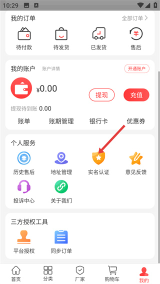 1、進入【我的】頁面,在【個人服務】板塊找到【實名認證】入口,點擊即可進入認證流程,開啟后續(xù)安全操作。