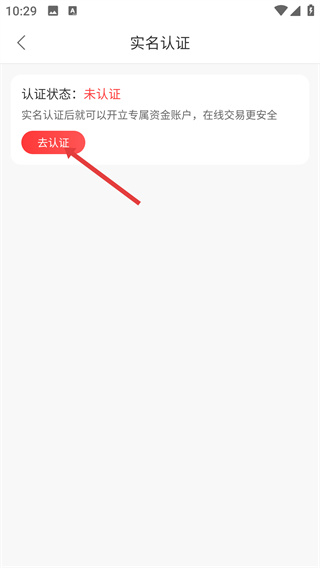 2、進入【實名認證】頁面,查看【認證狀態(tài)-未認證】,點擊【去認證】按鈕,即可進入認證類型選擇環(huán)節(jié)。