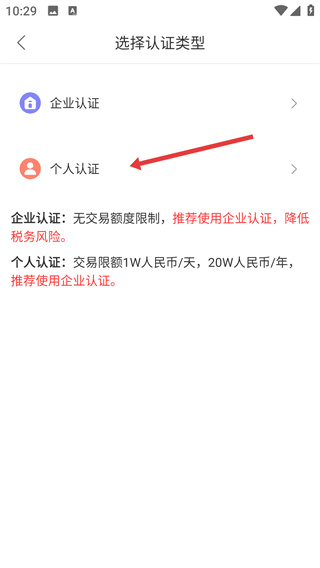 3、在【選擇認證類型】頁面,可選【企業(yè)認證】或【個人認證】,前者無額度限制,后者有每日1W-每年20W的限額。