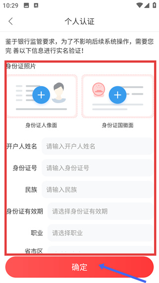 4、進入【個人認證】頁面,上傳【身份證人像面】和【身份證國徽面】,填寫信息后點擊【確定】完成認證提交。