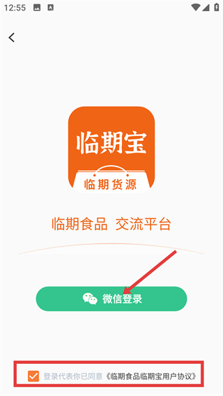 1、在臨期寶登錄頁(yè),勾選《臨期食品臨期寶用戶(hù)協(xié)議》后,點(diǎn)擊【微信登錄】按鈕,完成賬號(hào)的微信授權(quán)登錄。