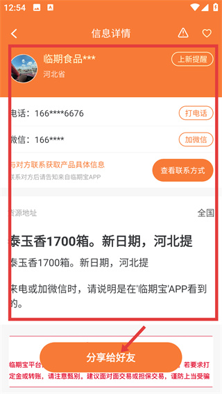 3、在信息詳情頁(yè),查看商家信息、貨源內(nèi)容后,點(diǎn)擊頁(yè)面底部的【分享給好友】按鈕,彈出分享渠道選擇窗口。