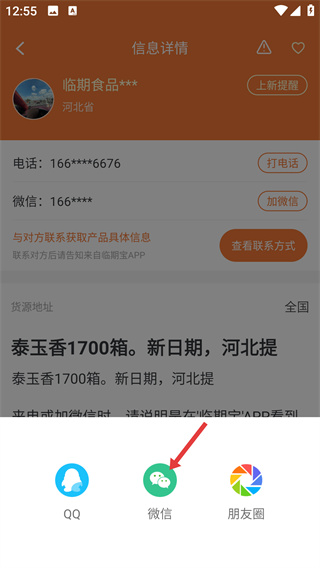4、在分享渠道窗口中,選擇【微信】選項(xiàng),即可將該貨源信息分享至微信好友或相關(guān)社交渠道。