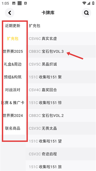 2、在卡牌庫(kù)界面,左側(cè)選擇“擴(kuò)充包”分類,右側(cè)點(diǎn)擊“CBB3C 寶石包VOL.3”選項(xiàng),進(jìn)入該系列對(duì)應(yīng)的卡牌列表頁(yè)面。