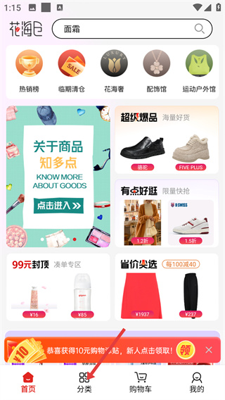 1、在首頁底部導(dǎo)航欄,點擊【分類】按鈕,進(jìn)入商品分類選擇頁面,可按品類精準(zhǔn)篩選商品。