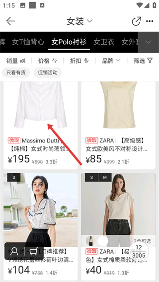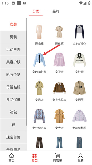 2、在分類頁面左側(cè)選擇“女裝”分類,右側(cè)點擊“女Polo襯衫”選項,進(jìn)入該品類對應(yīng)的商品列表頁面。