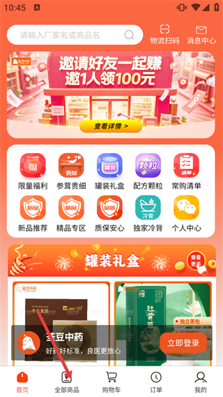 1、在首頁(yè)底部功能欄,點(diǎn)擊“全部商品”選項(xiàng),進(jìn)入商品列表頁(yè)面。