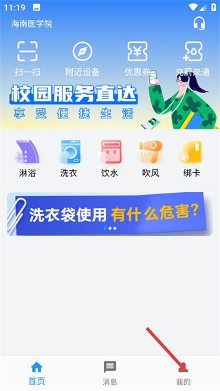 1、在學(xué)校的首頁界面,點擊底部導(dǎo)航欄的【我的】選項,進入個人中心頁面。