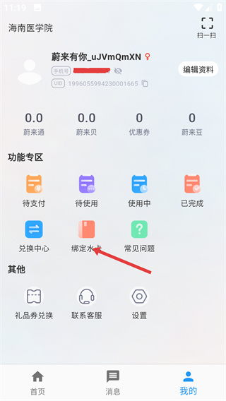 2、在個人中心的功能專區(qū)板塊中,找到并點擊【綁定水卡】選項,進入水卡對應(yīng)的操作頁面。