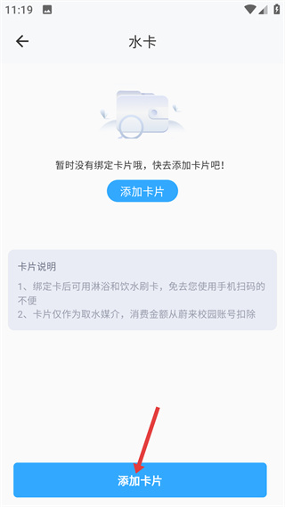 3、在水卡頁面,點擊【添加卡片】按鈕,進入添加水卡的具體操作界面。