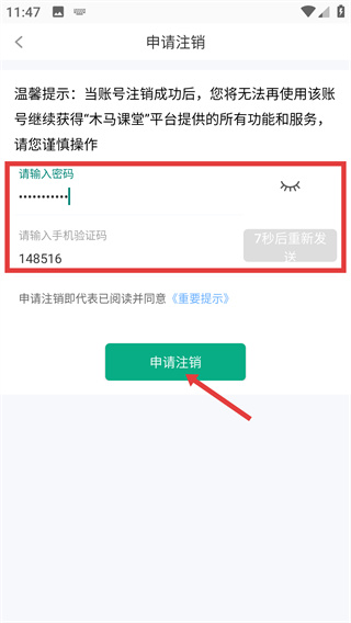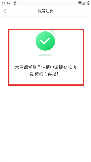 4、提交注銷申請后,頁面顯示【木馬課堂賬號注銷申請?zhí)峤怀晒Α康奶崾?,代表該賬號的注銷流程已完成。