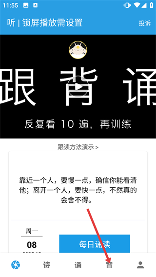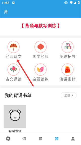 1、在【跟背誦】界面點擊【每日誦讀】,切換到底部【背】標(biāo)簽,進(jìn)入【背誦與默寫訓(xùn)練】的功能頁面。