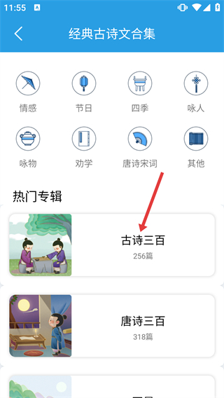 3、在【經(jīng)典古詩文合集】頁面,點擊含256篇的【古詩三百】選項,進(jìn)入該合集的具體內(nèi)容列表。