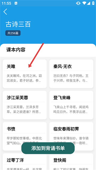 4、在【古詩三百】內(nèi)容列表中選擇《關(guān)雎》,點擊【添加到背誦書單】,即可將該篇目加入背誦列表。