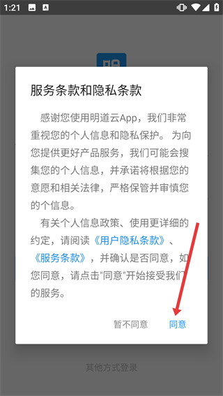 1、在服務(wù)條款和隱私條款彈窗中,點(diǎn)擊【同意】按鈕確認(rèn)相關(guān)條款,即可進(jìn)入明道云應(yīng)用的主界面。