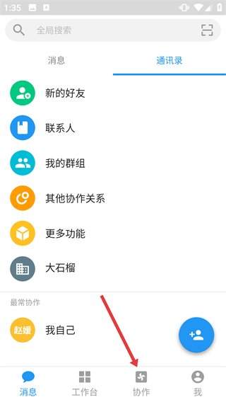 2、在消息界面點(diǎn)擊底部【協(xié)作】標(biāo)簽,可切換至協(xié)作功能頁(yè)面,查看日程、任務(wù)等協(xié)作相關(guān)內(nèi)容。