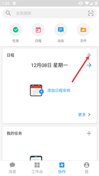 3、在協(xié)作頁(yè)面的日程板塊,點(diǎn)擊右上角的【+】按鈕,即可進(jìn)入創(chuàng)建日程的操作界面。
