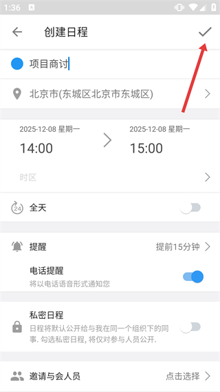 4、在創(chuàng)建日程頁(yè)面填寫(xiě)【日程名稱(chēng)】-【地點(diǎn)】-【時(shí)間】等信息后,點(diǎn)擊右上角對(duì)勾按鈕完成日程創(chuàng)建。
