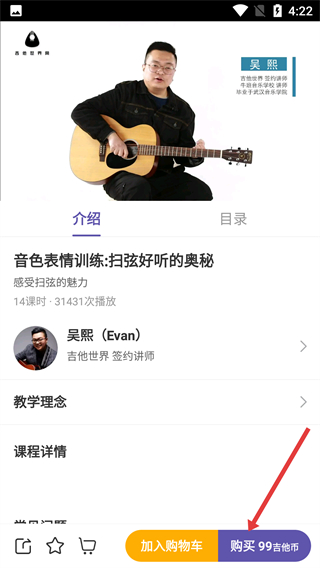 3、在課程詳情頁面,點擊【購買99吉他幣】按鈕,觸發(fā)登錄驗證的操作流程。