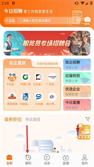 2、在求職主界面,點(diǎn)擊底部導(dǎo)航欄的“兼職”選項(xiàng),進(jìn)入兼職職位的列表頁面。