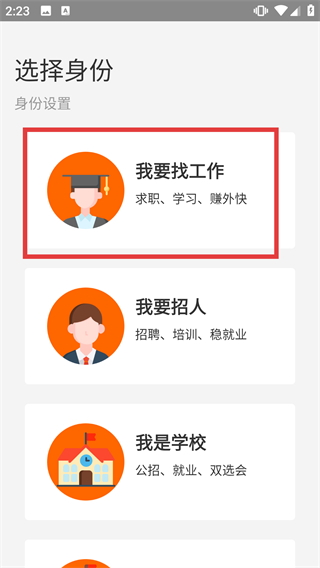 1、在身份選擇頁面,點(diǎn)擊“我要找工作”選項(xiàng)(對應(yīng)求職、學(xué)習(xí)等需求),進(jìn)入求職類主界面。
