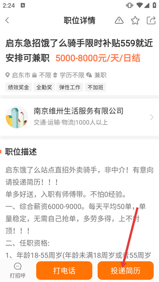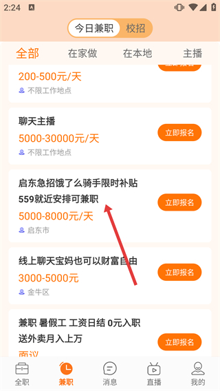 3、在兼職職位列表中,選擇目標(biāo)職位(如“啟東急招餓了么騎手限時補(bǔ)貼”),點(diǎn)擊進(jìn)入該職位的詳情頁面。