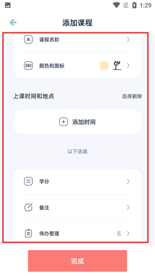 2、進(jìn)入添加課程頁面,需填寫【課程名稱】,配置【顏色和圖標(biāo)】,并添加上課時間與地點(diǎn)等信息。