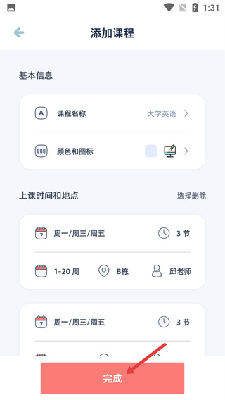 3、填寫好課程信息、上課時間地點(diǎn)后,點(diǎn)擊頁面底部的【完成】按鈕提交配置。